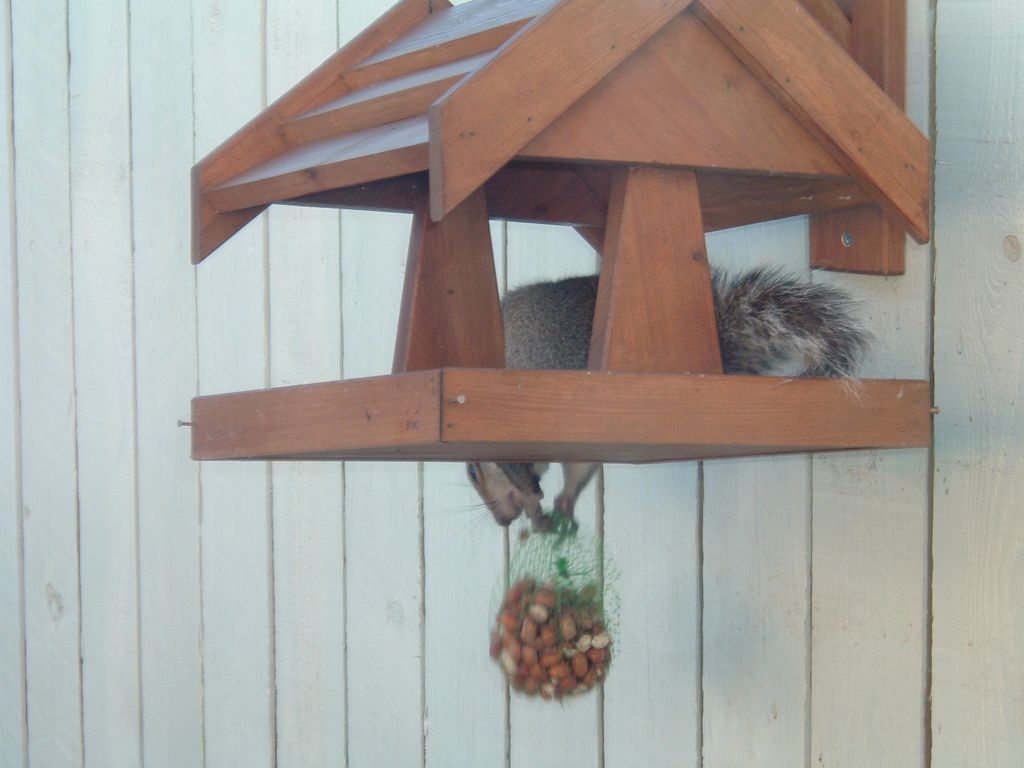 Second one is of the thricebedamned squirrel, Cookie. Right inside the table, trying to pull up the peanut bag off it's hook! Cheeky little sod didn't even move when I rattled the door, either; had to physically go outside to chase him off!!