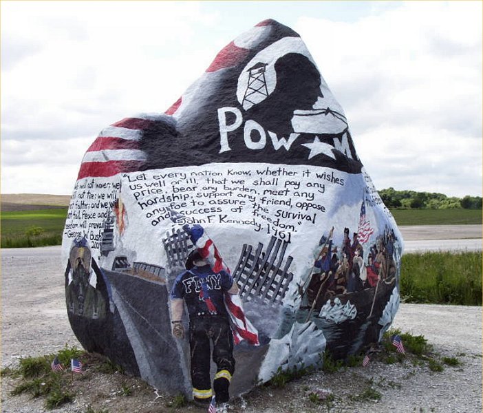 I'm told that there is a huge rock near a gravel pit on Hwy.25 in rural Iowa. For generations, kids have painted slogans, names, and obscenities on this rock, changing it's character many times. A few months back, the rock received it's latest paint job, and since then it has been left completely undisturbed. It's quite an impressive sight. Be sure to check out the multiple photos (all angles) of the rock. I thought the flag was draped over the rock, but it's not. It's actually painted on the rock too.