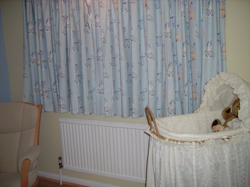 My Mum made the curtains and all the frills etc for the Moses basket and we fashioned the matching wall stickers by photocopying sections of the curtain fabric onto self adhesive paper - clever eh?!