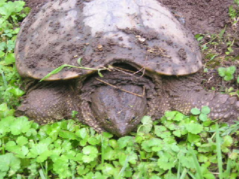 We awoke this morning to a new addition to our pet collection...Riley, our black Lab/Blue Heeler mix, was barking frantically at something in the side yard, just a few feet from the creek...the wife investigated, and found what she insisted was a snapping turtle...she, being the country girl was very sure what it was, & I wasn't about to argue so early in the day...but I did suggest that some pics would be a good thing.