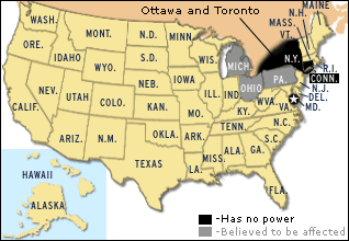 Cities affected include New York; Boston, Massachusetts; Cleveland, Ohio; Detroit, Michigan; Toronto, Ontario; and Ottawa, Ontario. The power outage occurred shortly after 4 p.m.