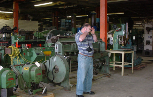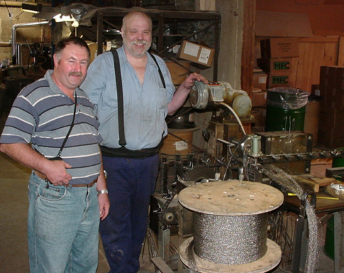 Grumbles stands with Tom, the owner of the 126 year old, family owned company, looking at a proprietary machine that processes material for use in wire wheels.