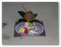 This ceremony is performed at the crack of dawn on the day of the wedding in the house of the bride and of the groom. About ten married women accompany the bride/groom to a nearby pond. They invite the Goddess Ganga to the wedding and bring back a pitcher of water from the pond to individually bathe the bride and the groom. Then they offer food to the bride/groom. The meal consists of puffed rice, raw yogurt, and sweets. The bride and groom cannot eat again until they are married. The relatives of the groom bless the bride and groom by placing yogurt on their foreheads (third eye) and saying prayers.
