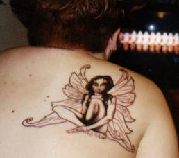 Thank you, thank you...well wait, I suppose my artist should be taking the praise eh? I need to get more pics done..since it's in full color now. Watercolors..blue body, purple and orange wings, fuscia hair and pale yellow eyes with pale green lips. She'll be part of a full fantasy-themed back piece