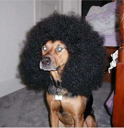 well, muthafuck... i dunno whether ta be flattered or insulted. either way, that is one damn psycho-sexy dog. and we both got sumthin in common: neither of us can naturally grow an afro, but we'd both benefit handsomely if we could. ...where's my gatdamn violin?